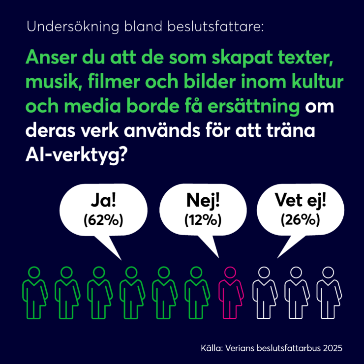 Resultaten visar att 61 procent av svenskarna anser att de personer som skapat texter, musik, filmer och bilder inom kultur och media borde få ersättning om deras verk används för att träna AI-verktyg.