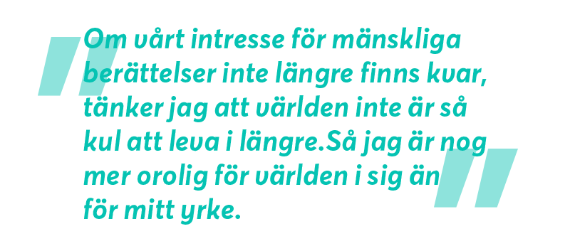 – Men samtidigt tänker jag att kultur- och featurejournalistik handlar mycket om ton, stil och personlig infallsvinkel. Sådant som inte är lika lätt för AI att lära sig. Om vårt intresse för mänskliga berättelser inte längre finns kvar, tänker jag att världen inte är så kul att leva i längre. Så jag är nog mer orolig för världen i sig än för mitt yrke.