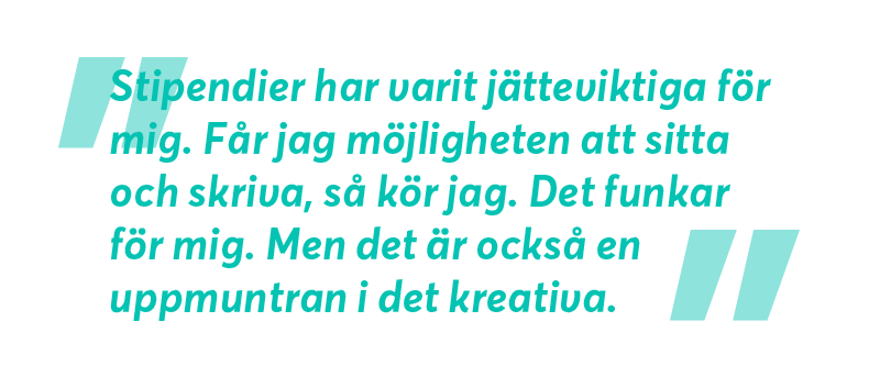 – Stipendier har varit jätteviktiga för mig. Får jag möjligheten att sitta och skriva, så kör jag. Det funkar för mig. Men det är också en uppmuntran i det kreativa. Att någon tycker att jag förtjänar en chans att göra detta. Det är stort, säger hon.