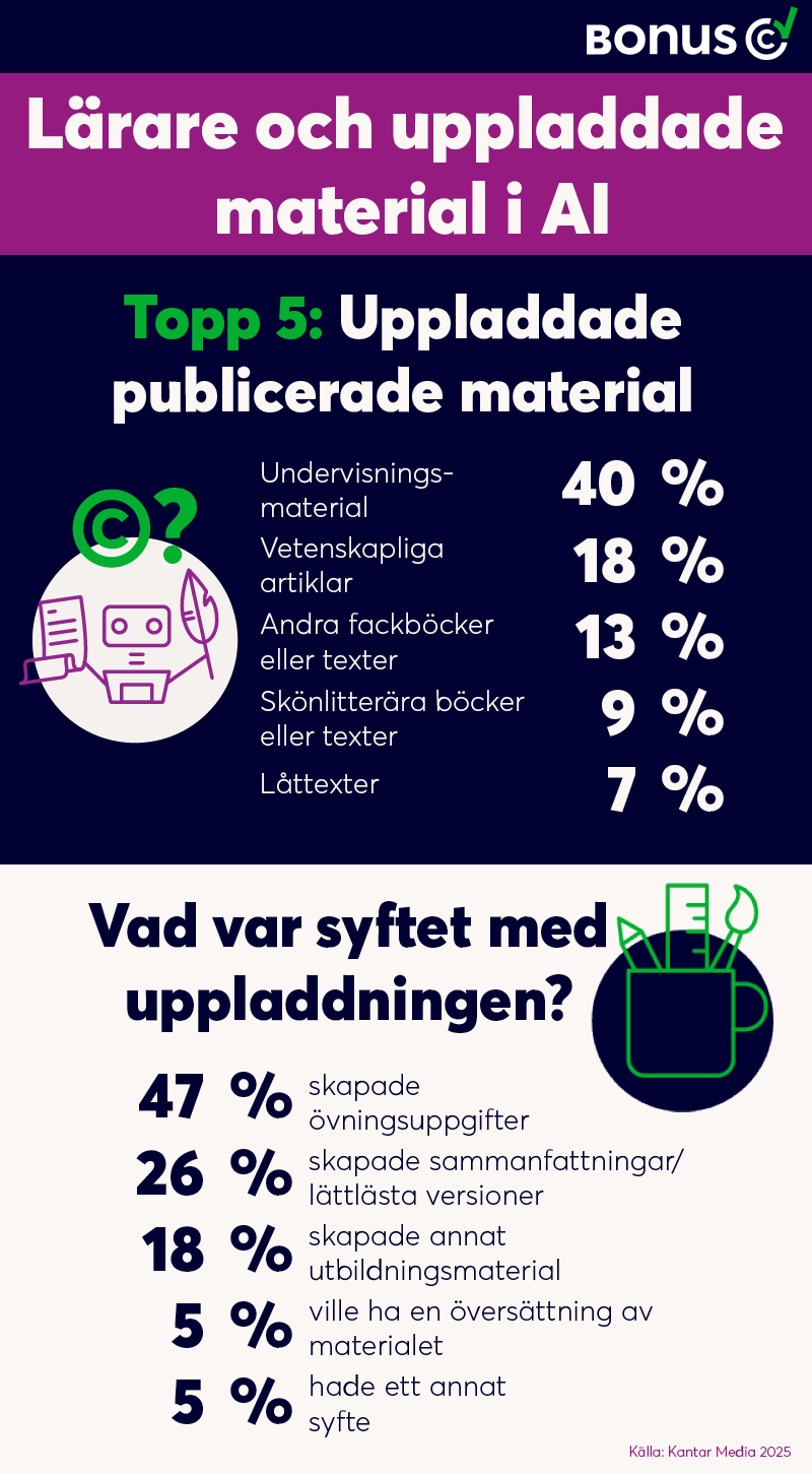 Av de svenska lärarna i årets nordiska undersökning säger 37 % att de laddat upp publicerat material i ett AI-verktyg medan 63 % säger att de aldrig har gjort det. I undersökningen 2024 svarade 27 % att de hade laddat upp material. De material som oftast laddades upp är olika sorters facktexter och utbildningsmaterial och syftet var oftast att skapa övningsuppgifter, sammanfattningar eller mer lättlästa versioner av texter.